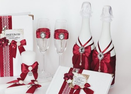 Bryllupsfargen til Marsala kan brukes til å dekorere hallen og bordene, samt et utvalg av bryllupsfunksjoner: invitasjoner, et bryst for penger, ønsker bøker. Denne fargen kan bestilles og bryllupskake. For bryllupet dekorasjonen i fargen på marsala, er flasker og glass rødvin, arrangert som dekorasjonselementer, perfekte. En bryllupsbukett med Marsala-farge ser veldig lys og uvanlig ut, men du kan bestille et mer forsiktig alternativ når flere farger i denne grunnskyggen kombineres med rosa eller hvitt.